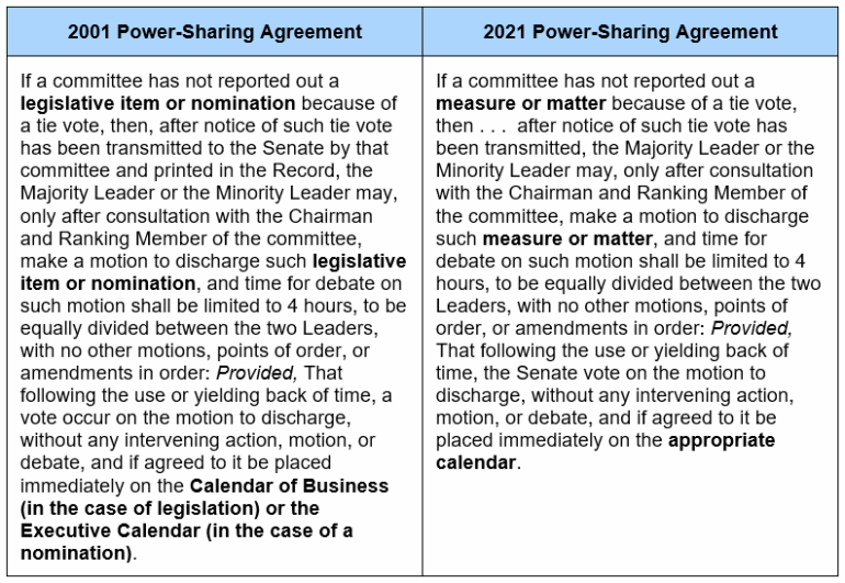 Senate Democratic Leader Chuck Schumer (D-N.Y.) and Republican Leader Mitch McConnell (R-Ky.) have noted that the 2021 agreement is “almost identical” to the 2001 agreement. There is little guidance on how that agreement was interpreted to apply to committee investigatory functions, perhaps because it was only in effect for five months. Interestingly, one of the few changes between the 2001 and 2021 agreements is found in the clause regarding tied committee votes. See the comparison below (substantive differences bolded by Covington).